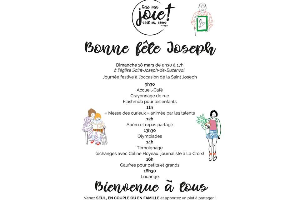 Aujourd’hui, toute la paroisse est en fête à l’occasion de la saint joseph (normalement le 19 mars). Nous vous attendons venez nombreux ! Seul, en couple, en famille ou entre…